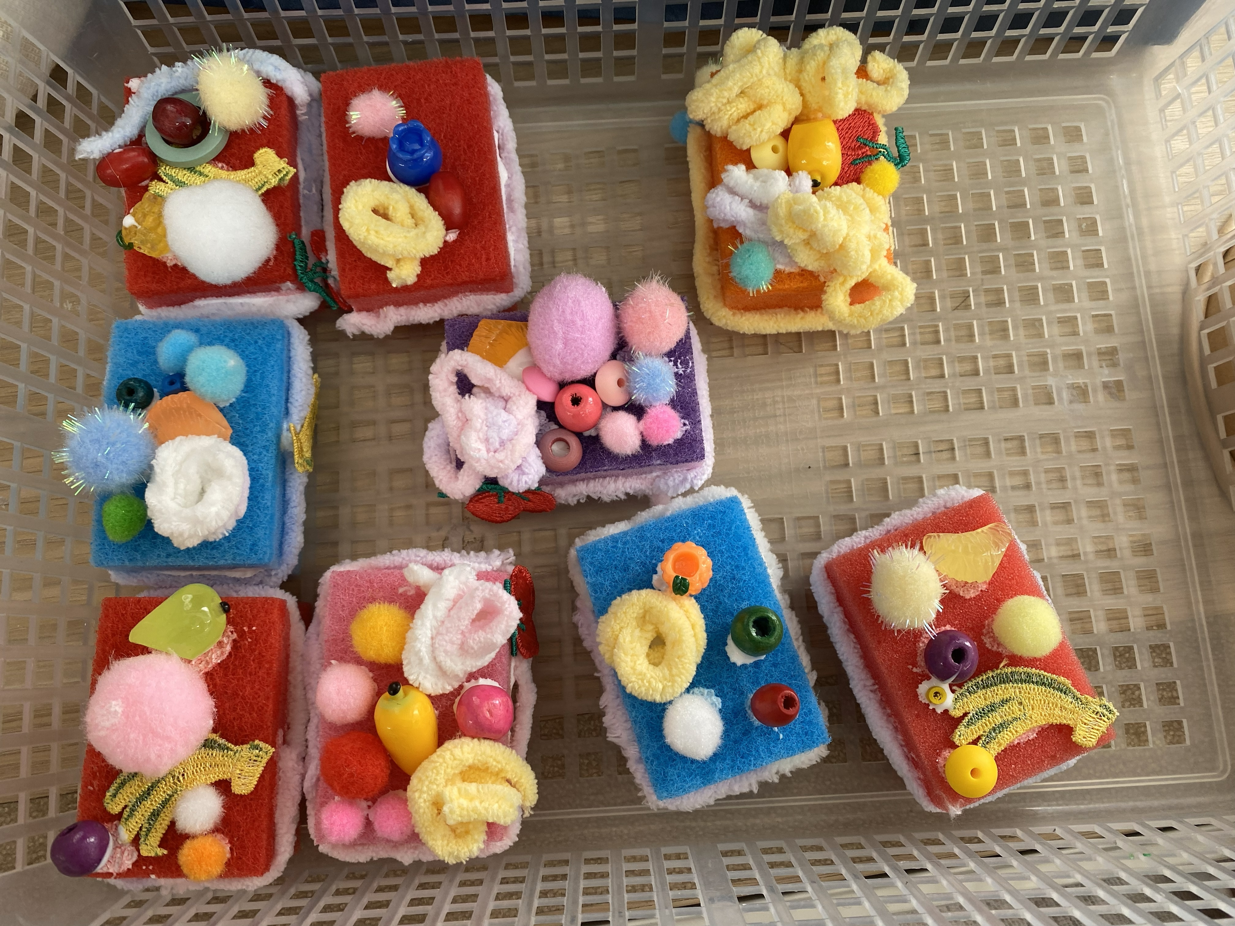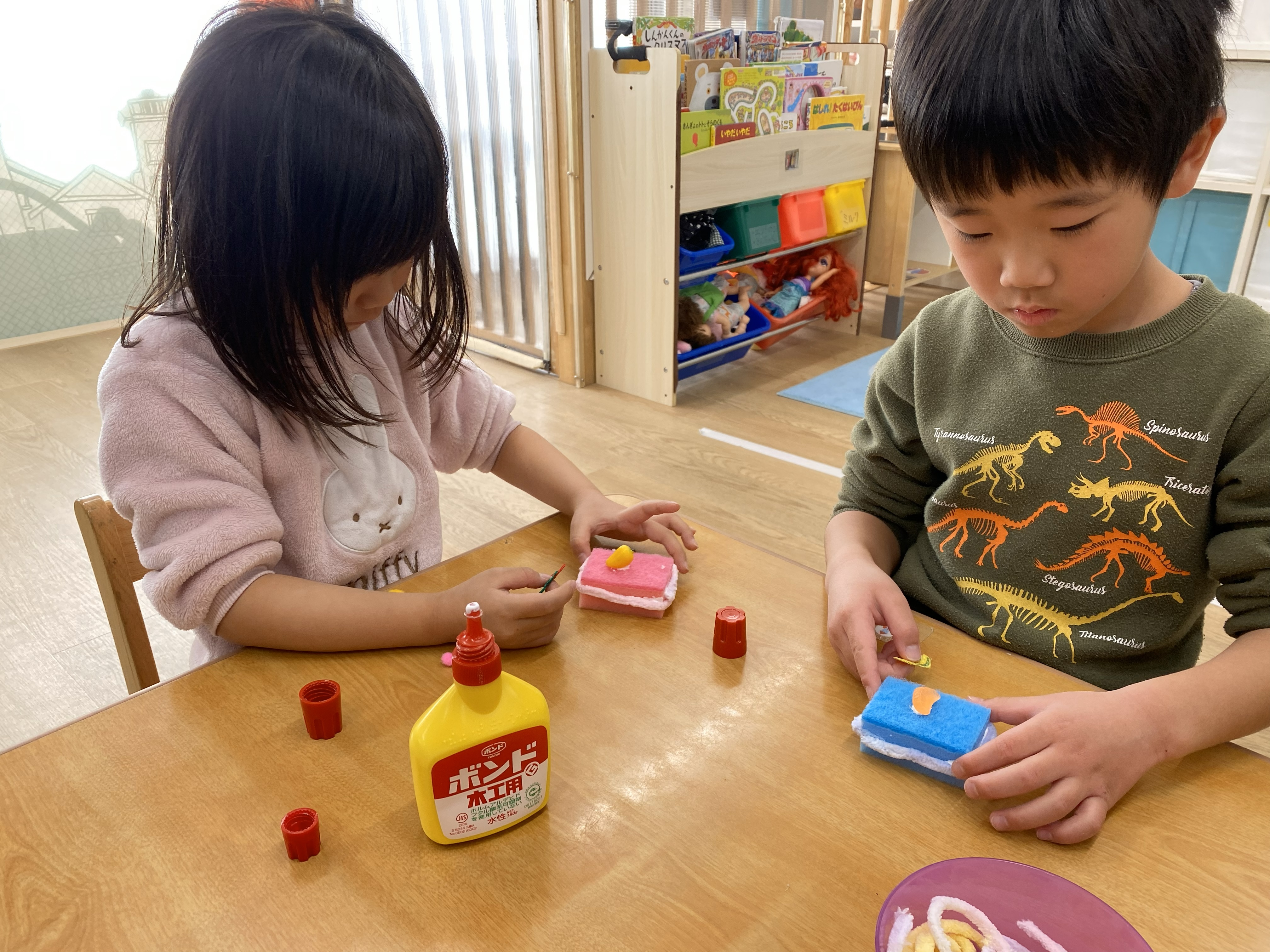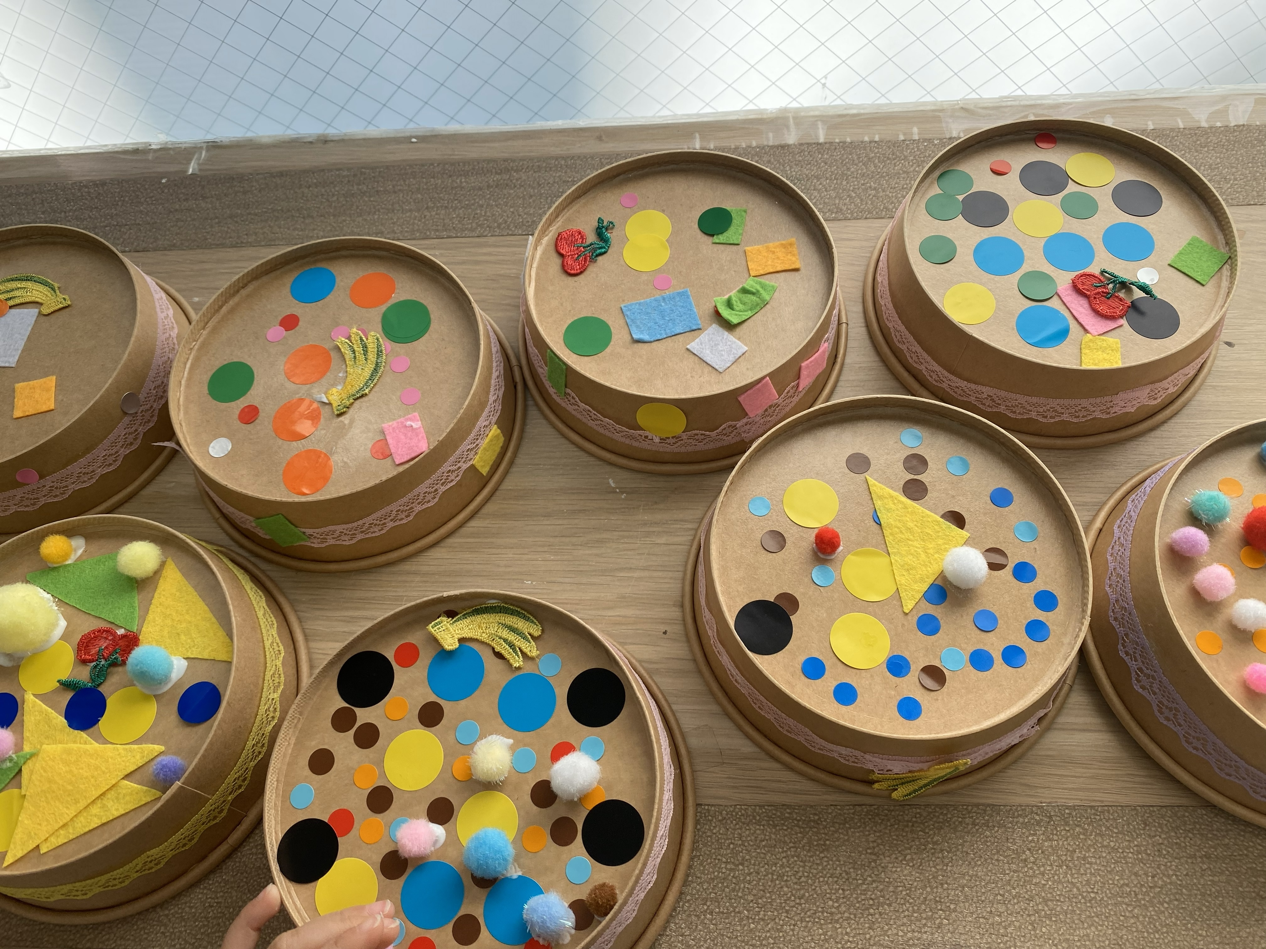 小さい子クラスは、大きめのカップに、フェルトシールやボンボンを貼ったり、