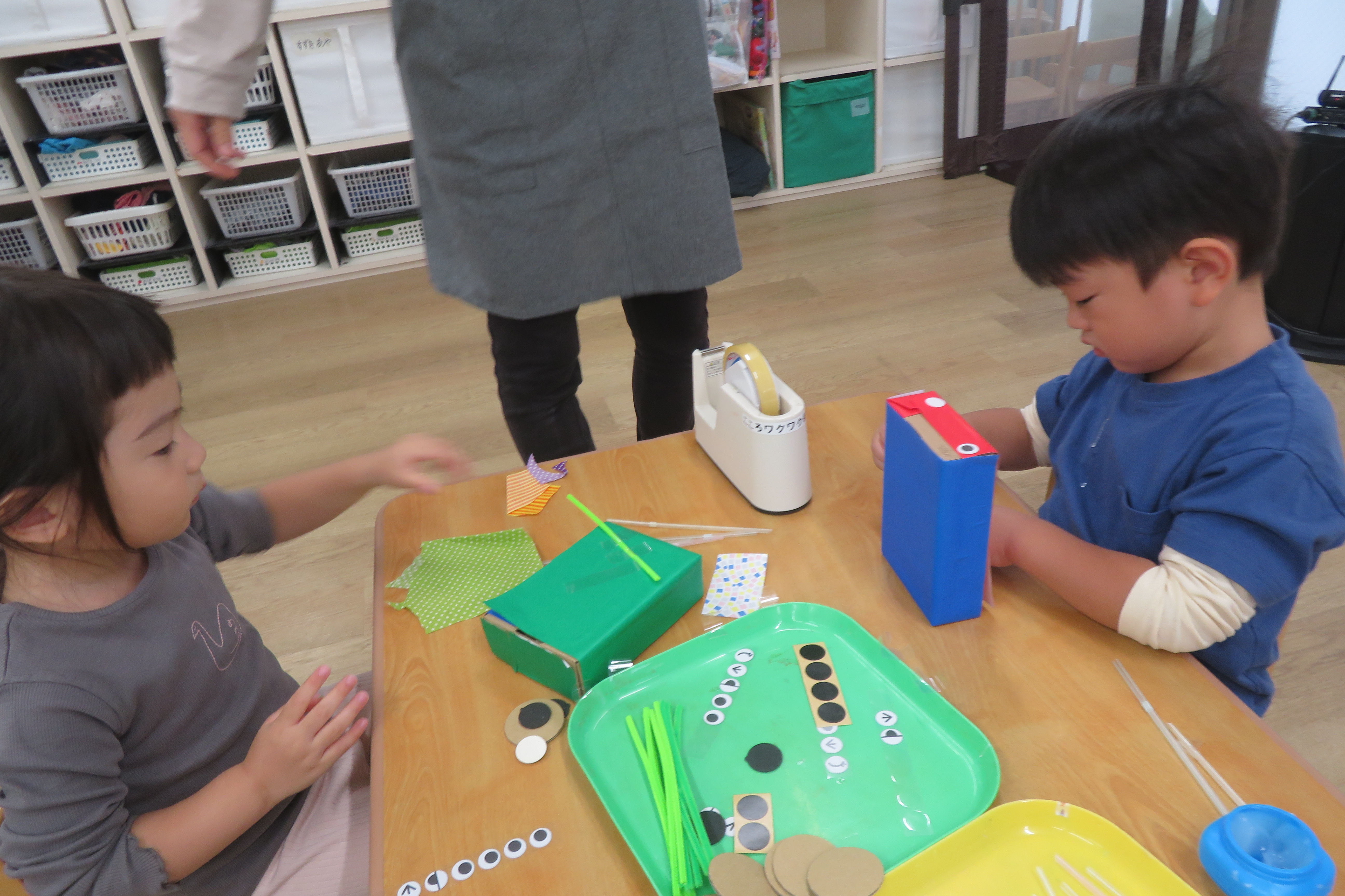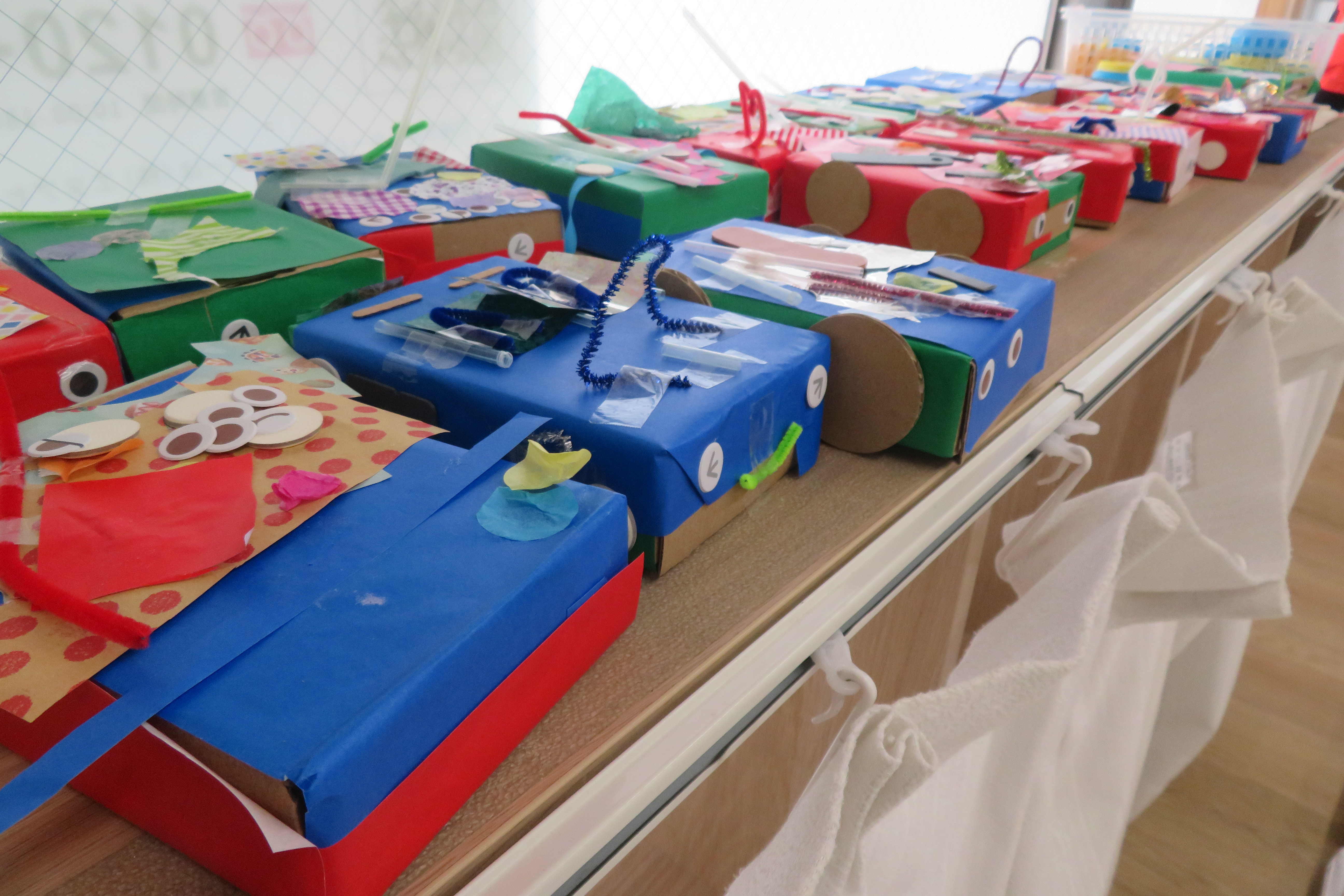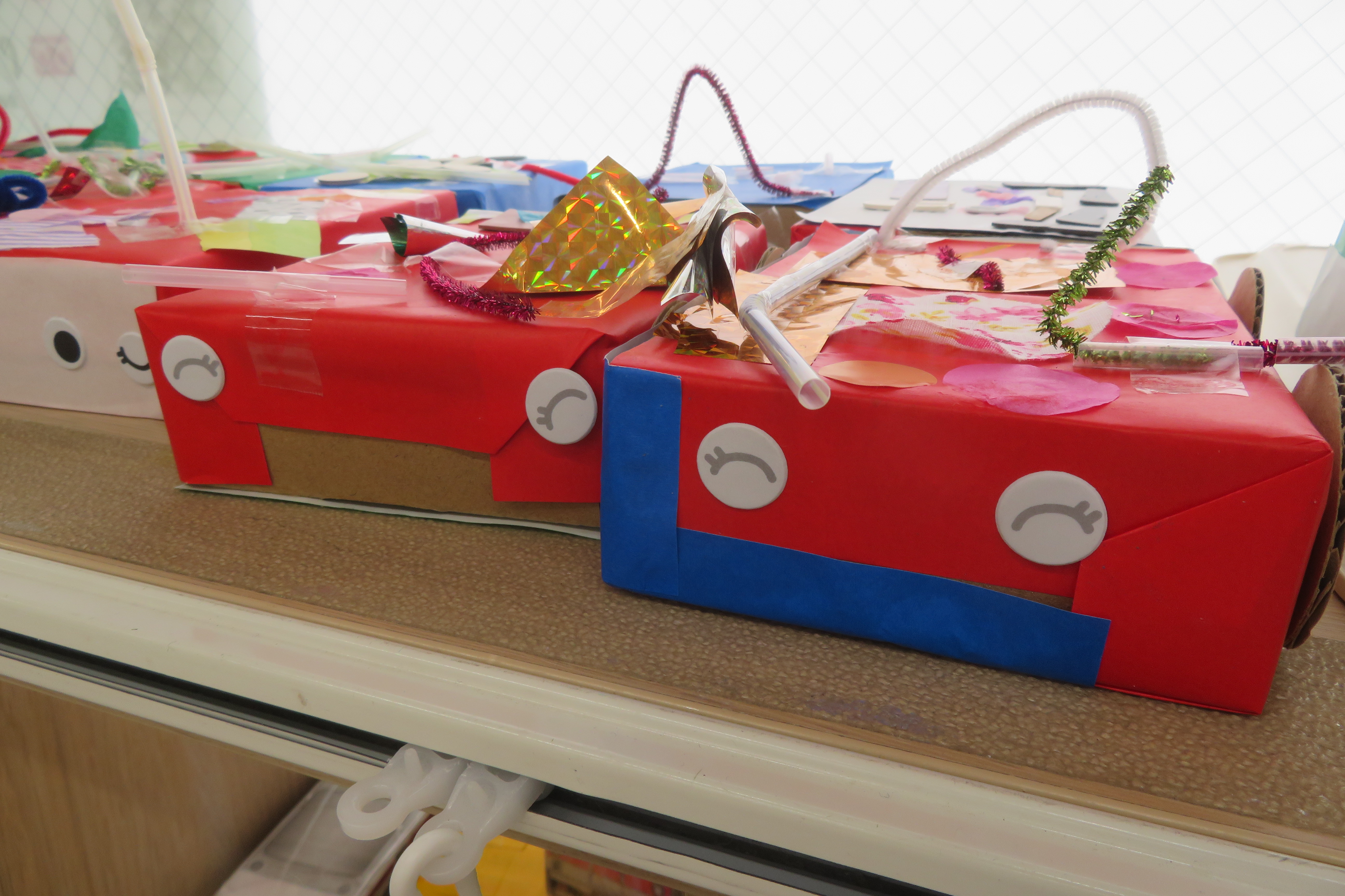箱に折り紙や、布やシールなど貼り付けて、